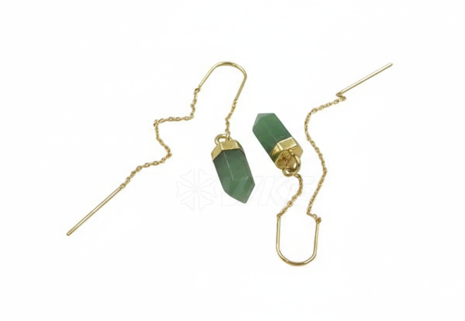 Crafted from natural green aventurine gemstones, these delicate earrings feature a gold-plated geometric hexagon design measuring approximately 65 x 8 mm. Finished with genuine 18K gold plating, each piece is unique, showcasing subtle variations in size, shape, and color. Perfect for those who appreciate raw, natural beauty, these one-of-a-kind earrings offer an elegant and distinctive accessory option.  The "good luck" stone.