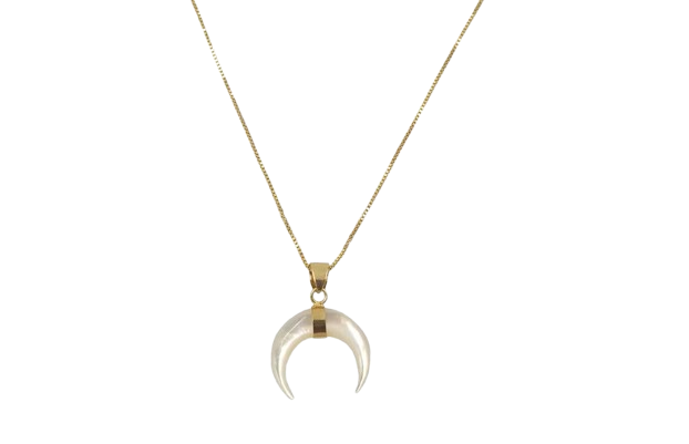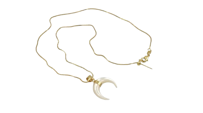 Featuring an 18-inch 18K gold-plated chain, this necklace showcases a natural mother of pearl pendant. Each crescent-shaped piece is unique, with slight variations in size, shape, and color, emphasizing its raw and authentic beauty. Measuring 18x20mm, the pendant resonates with the symbolism of luxury, purity, and prosperity. Known for promoting calming energy, enhancing intuition, and offering protective qualities, mother of pearl reflects maternal wisdom and the divine feminine. Ideal for layering, it complements a curated collection that elevates your personal style with refined, meaningful elegance.