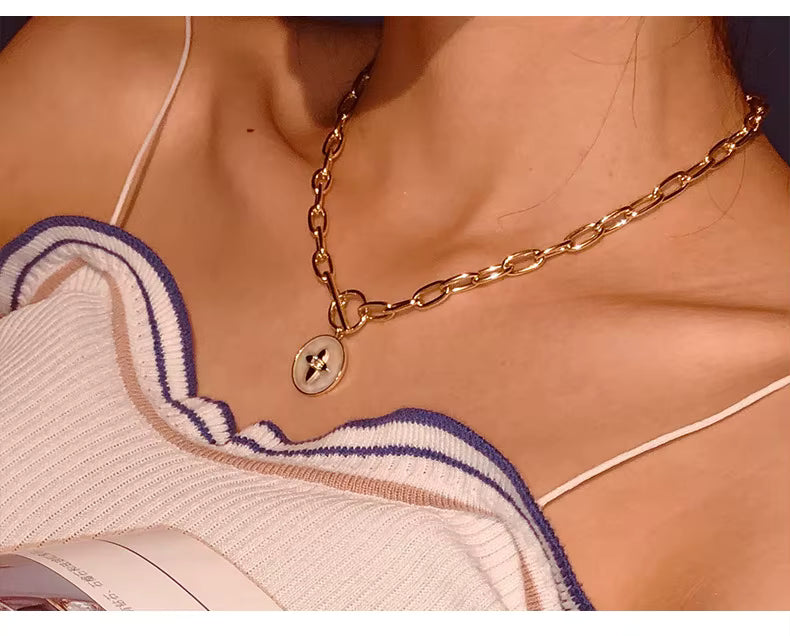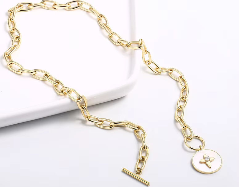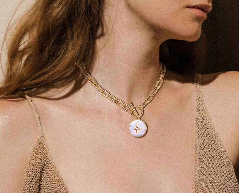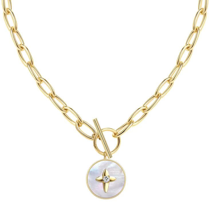 Elevate your everyday style with this sophisticated link chain choker featuring a natural shell round pendant adorned with star-shaped cubic zirconia pavé detailing. Crafted in 14k gold plating, this 16.5-inch necklace combines timeless elegance with contemporary design sensibilities. The approximately 18mm pendant strikes a perfect balance between statement-making presence and refined subtlety, embodying the quiet luxury aesthetic that defines modern minimalist jewelry. An investment piece that seamlessly transitions from casual to formal occasions.